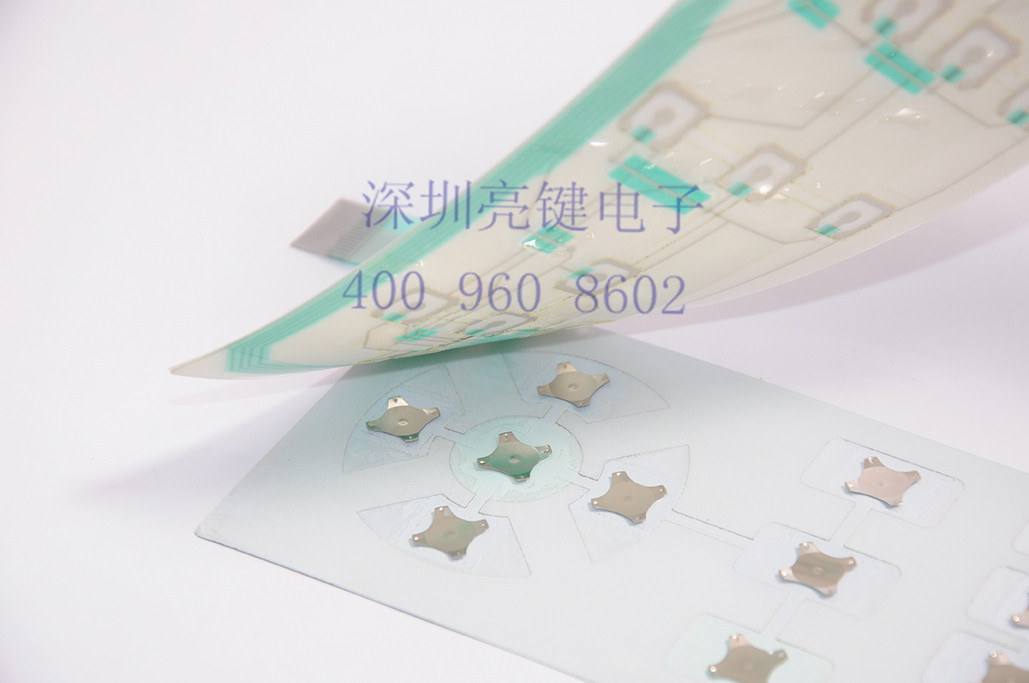 弹片在柔性薄膜开关中的应用主要是提供触觉反馈(即手感),一般不用,其弊端是金属弹片的行程与开关触点间行程之间的差距导致弹片与开关不能  同步。就是说,当弹片产生了动作时,开关触点未必 也同时动作。而且在柔性线路板中,弹片动作往往超过其底部的水平面,操作力过大时,易使弹片向相反方向变形而不能回复,俗称“翻死”。实际上在柔性线路板中,可通过线路层起鼓来提供手感。我厂拥有先进的起鼓设备和工艺,保证起鼓均匀,手感好。