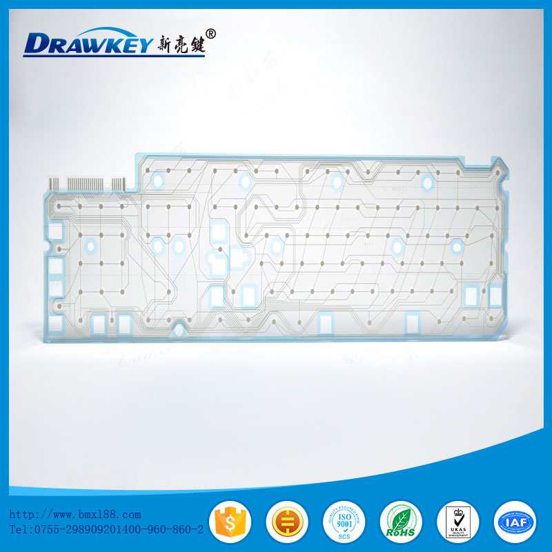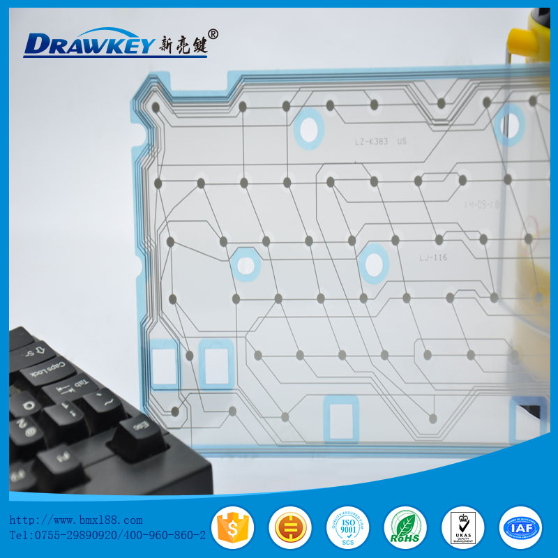 • 防水电脑键盘导电膜规格: 1.银线设计及印刷宽度:4mm(特殊走线密度大按照客户要求设计);最小间隔0.3mm,线路毛边<1/3,线路缺口<1/4 2.银线印刷厚度:3~5um 3.银线回路电阻800~1000Ω 按照客户要求订制 4.按键开关寿命:>100万次 5.键标作力:15~750g力