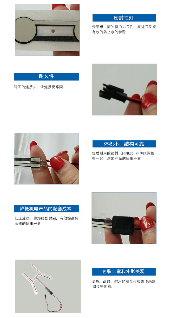 该传感器具备超薄、柔性、耐用、超低功耗、极速响应、薄膜型、压力触发、压力检测范围广和易于集成等特性。当座椅位置受来自于外部的重力时它是能感受被测物并转换成可用输出信号。传感器的触点均匀分布在座椅的受力表面各个位置,以用来精确的检测是否有人。