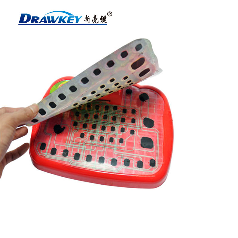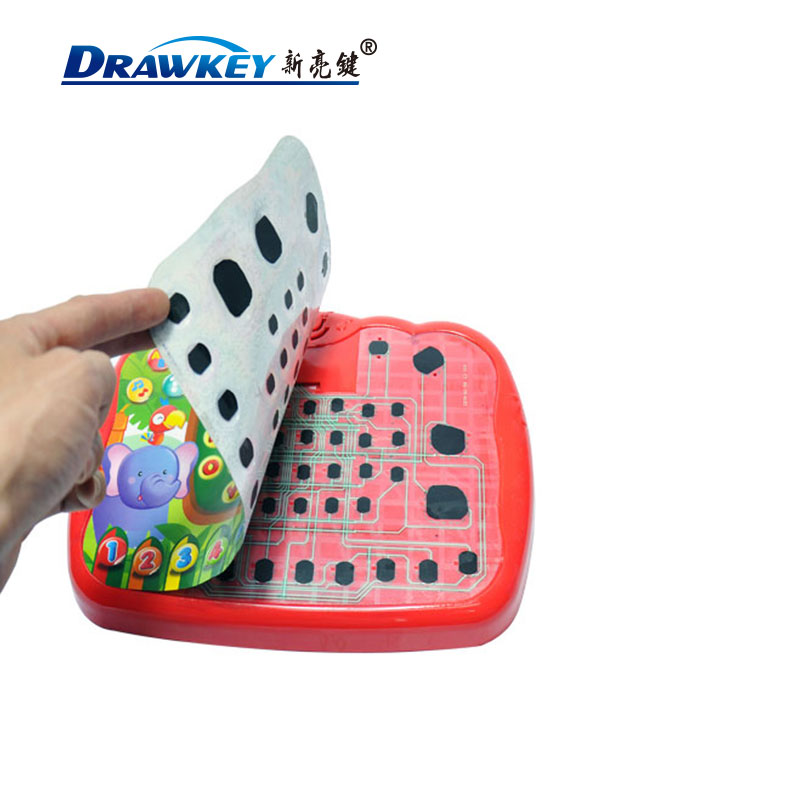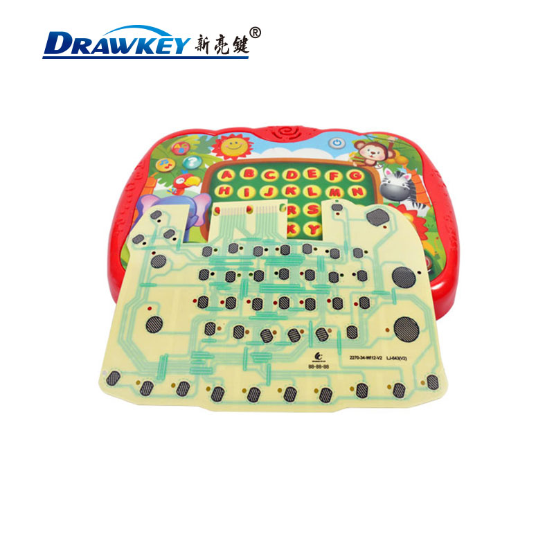 • 产品说明: 1.适用于益智类儿童玩具 2.0.1mm厚PET印刷银线路,跳线。覆盖UV 保护线路氧化 3.工艺可印刷0.05~0.1mm 高凸点、碳点,满足客户按键手感。 4.此产品为单面,印刷3M背胶。信赖性温湿度保存实验条件:-20~85℃