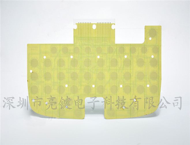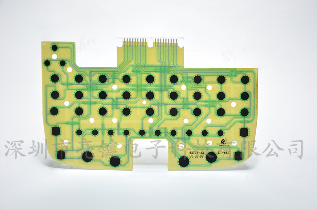 - 1.薄膜线路2层设计:成本节减 2.薄膜线路背胶使用印刷3M 胶水:粘性经过高低温测试PASS 3.PET 印刷银浆线路 4.凸点使用UV :0.05~0.1mm 高度精密印刷 5.印刷碳点按键,成本节减
