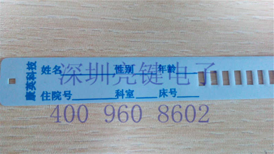 - 腕带,用于电子病历系统、电子医院管理系统及住院病人管理系统中对病人的识别和管理,可根据采用管理系统的要求,将患者的个人信息(如姓名、年龄、通信地址、联络电话、监护人联系方式、、医保证、号码等)和病理信息(如血型、病史、过敏药物以及其它医学特征信息等),存入腕带的芯片中,用与系统连接的读写器可读出这些信息,为医院的治疗、化验、检查、手术、服药、订餐、费用支付等管理服务。也可用于老幼,慢性病患者以及自我表述能力障碍的人员,作为身份识别的一种管理工具 供应热线:400-960-8602