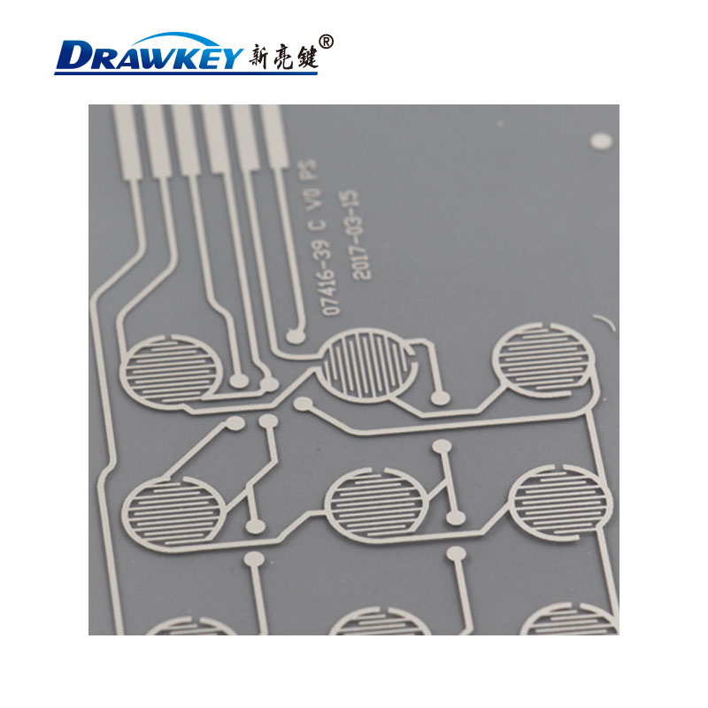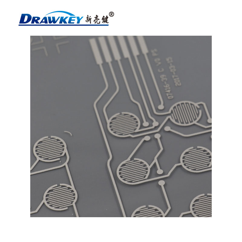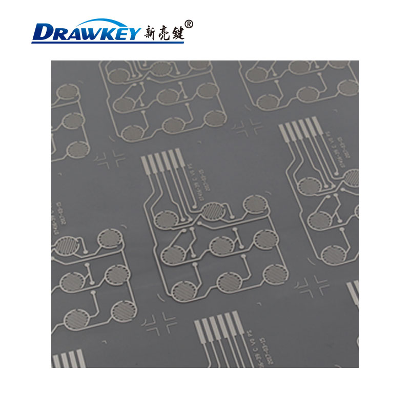 银浆导电膜是一种以PET薄膜为基材制成的柔性线路板,并具有可挠性。银浆导电膜三层设计,上、中、下三层导电膜,上、下层分别印有电路连线及按键触点,中间隔层上有上、下触点层对应的圆孔,隔层的作用是防止上下层电路短路。